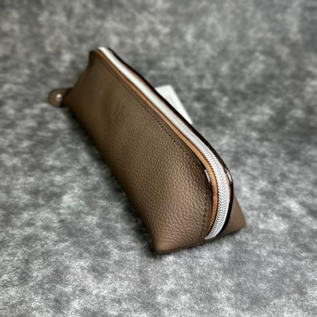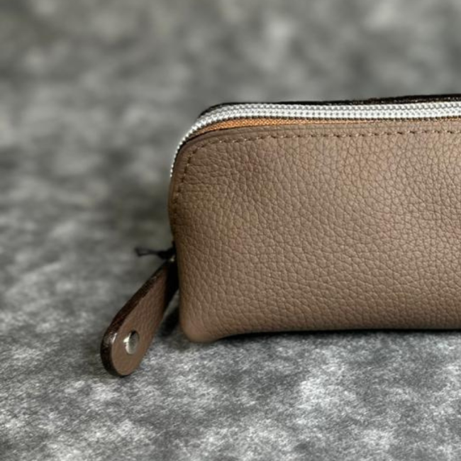 Trousse en cuir de vachette grainé taupe au design intemporel, conçue pour un usage quotidien. Robuste et agréable au toucher,